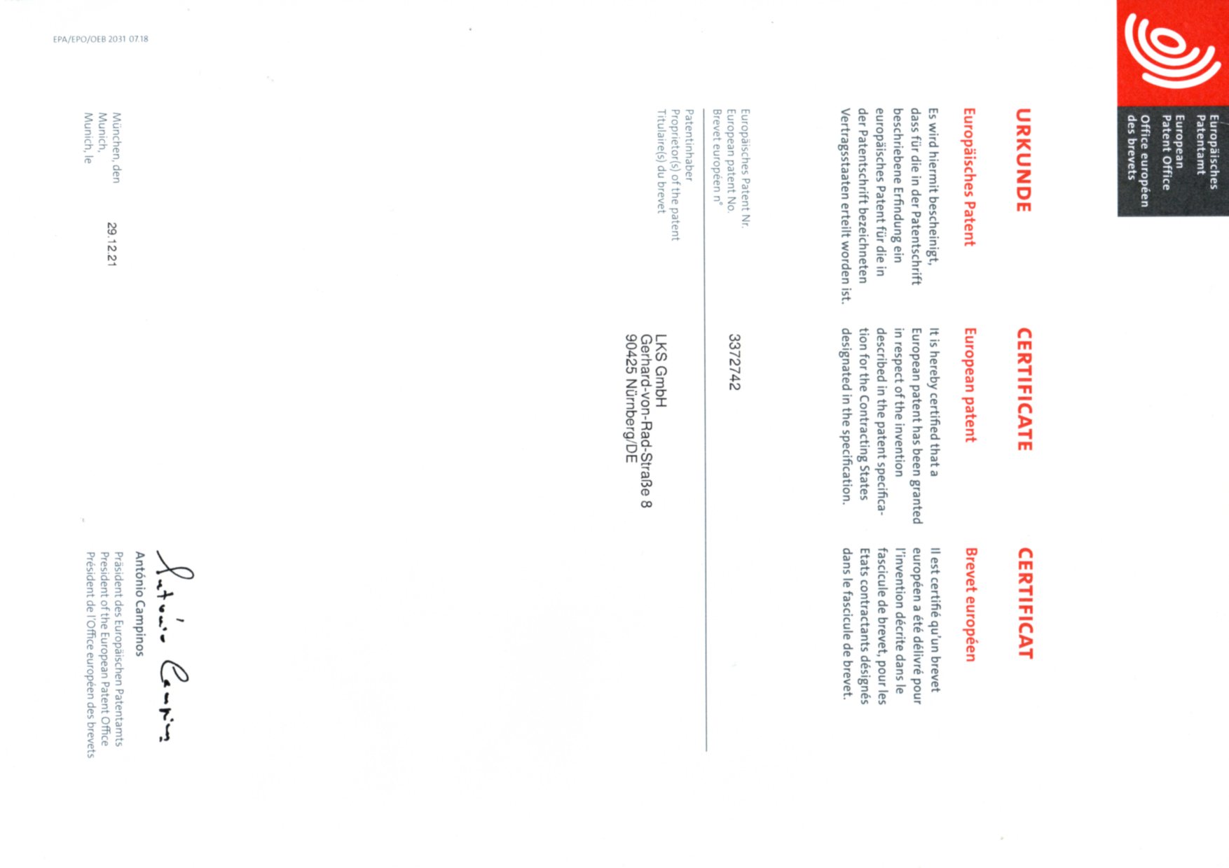 Patenturkunde des Europäischen Patentamts